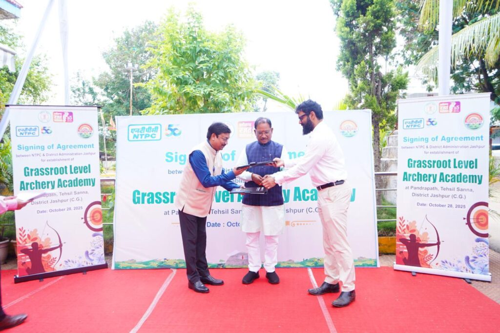 दैनिक मूक पत्रिका रायपुर,- मुख्यमंत्री विष्णु देव साय की उपस्थिति में आज जशपुर जिले के बगिया स्थित मुख्यमंत्री कैंप कार्यालय में बगीचा विकासखंड अंतर्गत सन्ना पंडरापाठ में तीरंदाजी अकादमी स्थापित करने के लिए जिला प्रशासन और एनटीपीसी के बीच एग्रीमेंट किया गया। एनटीपीसी द्वारा यह परियोजना कॉर्पोरेट सामाजिक दायित्व (CSR) के तहत 20 करोड़ 53 लाख रुपए की लागत से संचालित की जाएगी। इस अवसर पर कलेक्टर रोहित व्यास और एनटीपीसी के अपर महाप्रबंधक (मानव संसाधन) बिलाश मोहंती उपस्थित थे।