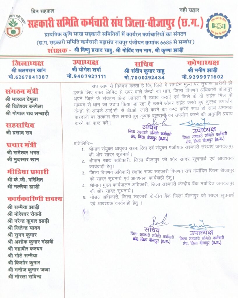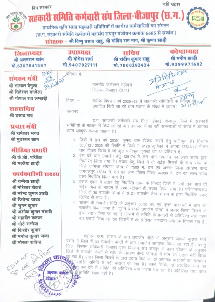 मूक पत्रिका/बीजापुर | खरीफ विपणन वर्ष 2025–26 में धान के उठाव में हो रही देरी को लेकर छत्तीसगढ़ सहकारी समिति कर्मचारी संघ, जिला बीजापुर ने बुधवार को बीजापुर एसडीएम के माध्यम से माननीय कलेक्टर महोदय को ज्ञापन सौंपा। संघ ने धान के शीघ्र उठाव की मांग करते हुए उपार्जन केंद्रों पर उत्पन्न हो रही समस्याओं से एसडीएम जागेश्वर कौशल को अवगत कराया।